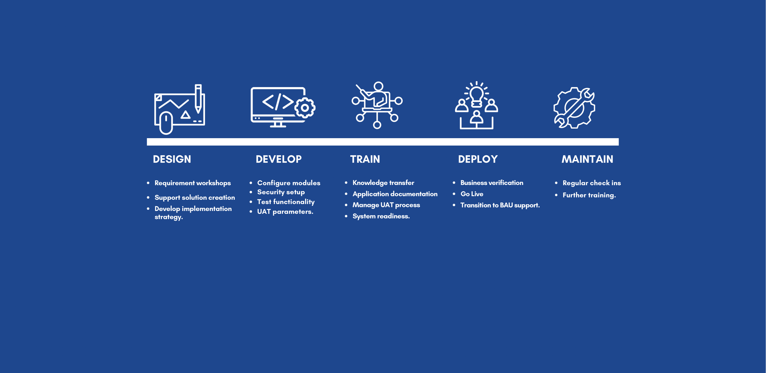 Develop - We delve deep in the tech here. Configuration, security, testing and UAT. It is where all the work behind the scenes happens to provide you with the start of the art finance solution.